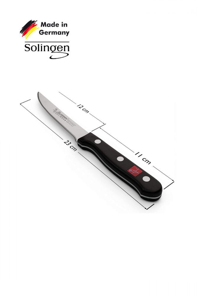 12 cm bıçak kısmının uzunluğudur. Sap dahil değildir. BAKIM TALİMATIMIZ: Sadece sıcak suda temizleyin (az miktarda bulaşık deterjanı kullanın). Meyve, sebze ve hardal kalıntıları ile soslar bir an önce tamamen temizlenmelidir, aksi takdirde bu ürünlerde asitlerin neden olduğu pas lekeleri oluşabilir. Asla sert zeminlerde (örneğin paslanmaz çelik veya cam) kesme yapmayın. Bunun yerine ahşap veya plastik yüzeyler kullanın. Bıçağı asla bir alet (örneğin tornavida, teneke açacağı veya levye) olarak kullanmayın, çünkü bu bıçağa zarar verir. Bıçak blokları veya manyetik tutucular kullanmak bıçağı korur. Bıçağı güvenli bir yerde saklamanın yaralanma riskini en aza indireceğini unutmayın. Bulaşık makinesinde yıkanmaz. Burgvogel Solingen Bu bıçak, yarım asırlık bıçak üretim deneyimine sahip Burgvogel tarafından Solingen Alman yüksek kalitesiyle üretilmiştir. Özel el dövmesi, buzlama ve yağ verme işlemleriyle sertleştirilmiş Krom-Vanadyum-Molibden alaşımlı (X50CrMoV15) çelikten üretilmiştir. 56 HRC çelik sertliğine sahiptir. Bu sayede son derece sağlam, keskin, paslanmaya dayanıklı ve kolay temizlenebilir bir yapıya sahiptir. Ergonomik tasarımı sayesinde rahat ve kolay kullanım sağlar.